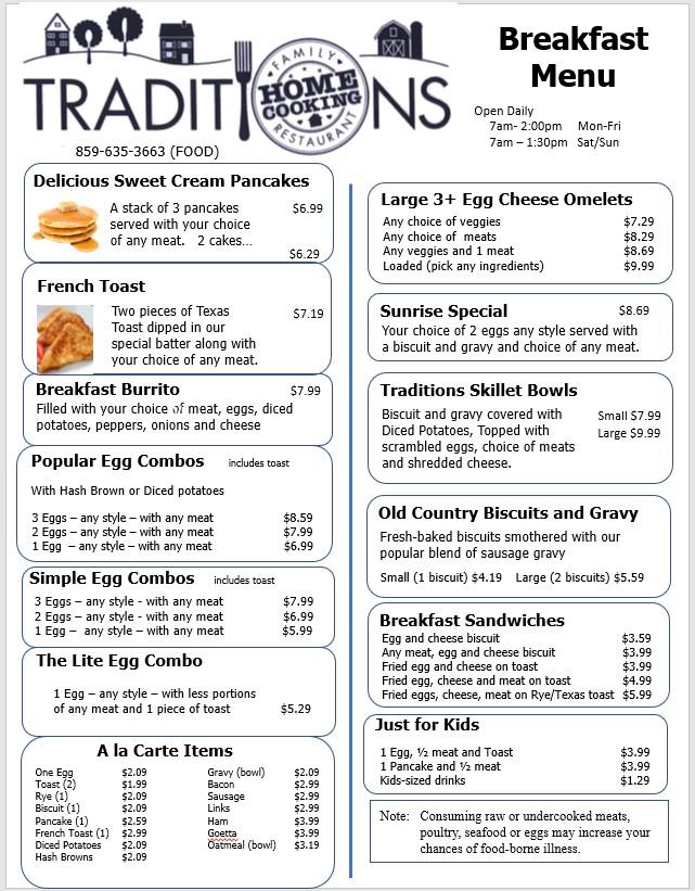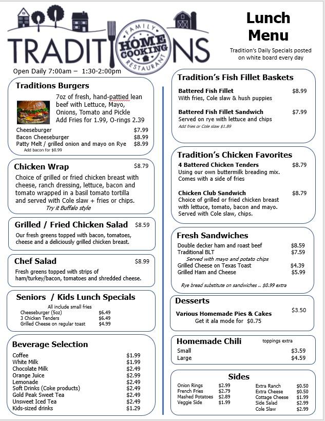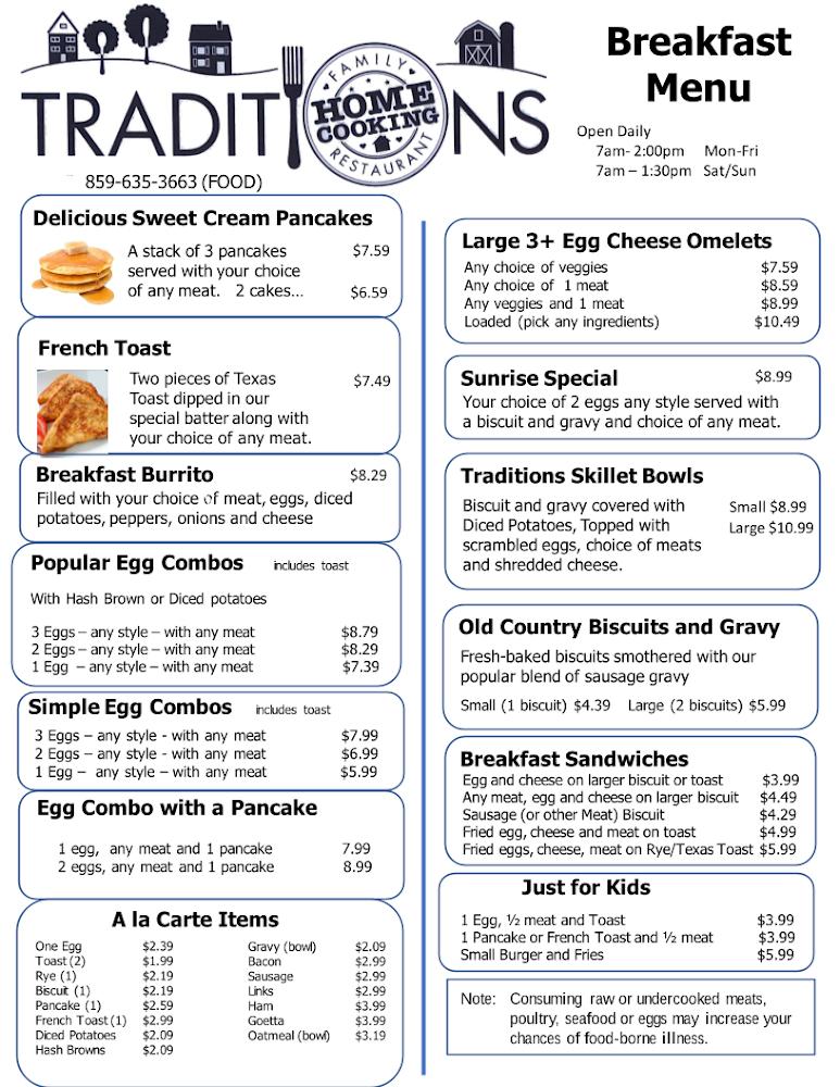 Welcome to Traditions Family Restaurant, your go-to spot for heartwarming, home-cooked meals in southern Campbell County! Open daily from 7 AM to 2 PM, we specialize in breakfast and lunch that will make you feel right at home. Enjoy our extensive menu featuring local specialties, excellent coffee, and delightful desserts, all in a casual atmosphere perfect for families and solo diners alike. Located just steps from A.J. Jolly Park and Golf Course, we offer dine-in, carry-out, and delivery services. Discover why we’re the best-kept secret in the area—come visit us at 11500 Alexandria Pike, Alexandria, KY!