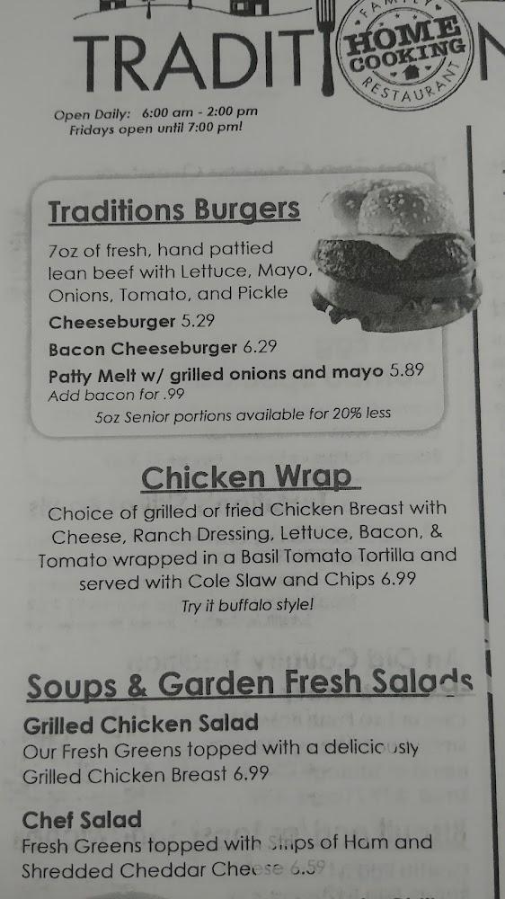 Desserts, particularly pies, are an exciting addition, perfect for those needing a sweet finish. With affordable pricing, there is something for everyone, making Traditions a valued dining destination.